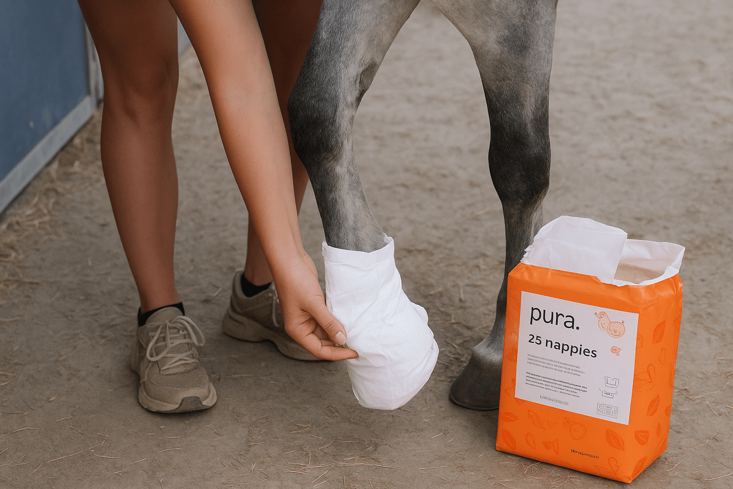 Voici aussi le meilleur rapport que j'ai trouvé pour ces couches de nouveau-nés (2-5kg) pour envelopper le sabot du cheval (de taille "classique"). En plus, ces couches sont enrichies en coton biologique et ne contiennent pas d'éléments allergisants.